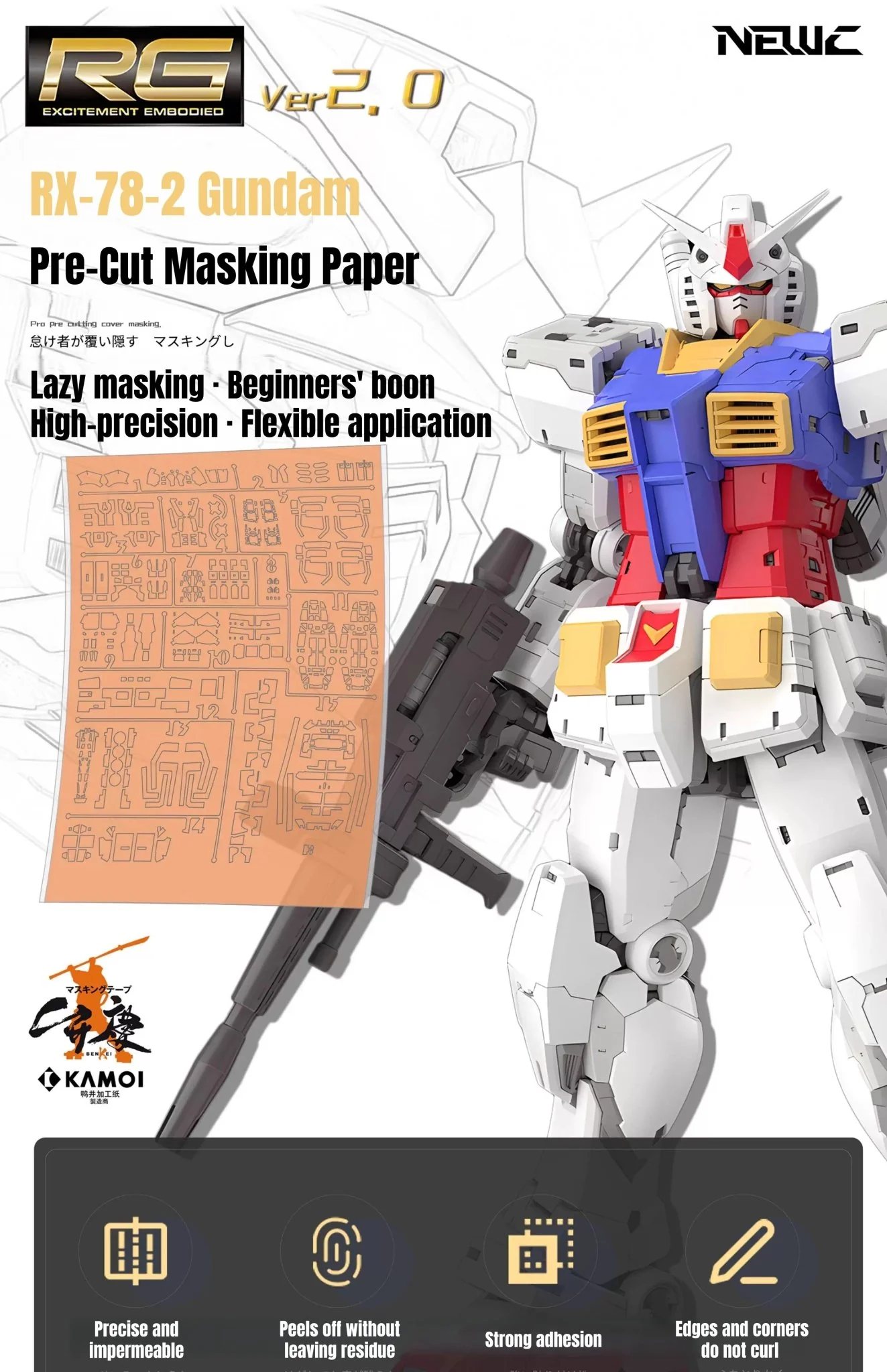 - The pre-cut masking sheet is laser-traced from the actual RG RX-78-2 Ver.2.0 part contours — every mask aligns flawlessly with armor panels, vents, and frame details. Letter-coded sections let you tear and apply without scissors, while the medium-high adhesion washi paper stays secure during spraying and peels off residue-free, revealing razor-sharp color borders.